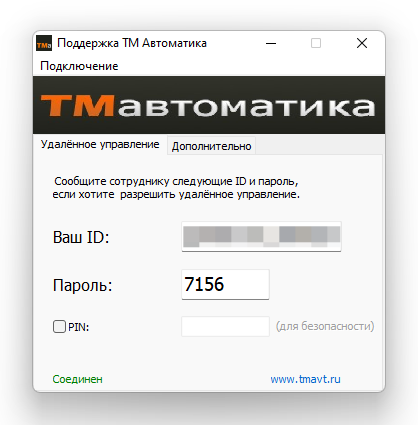 - Откроется окно программы удаленной поддержки. Сообщите сотруднику поддержки имя и пин-код.